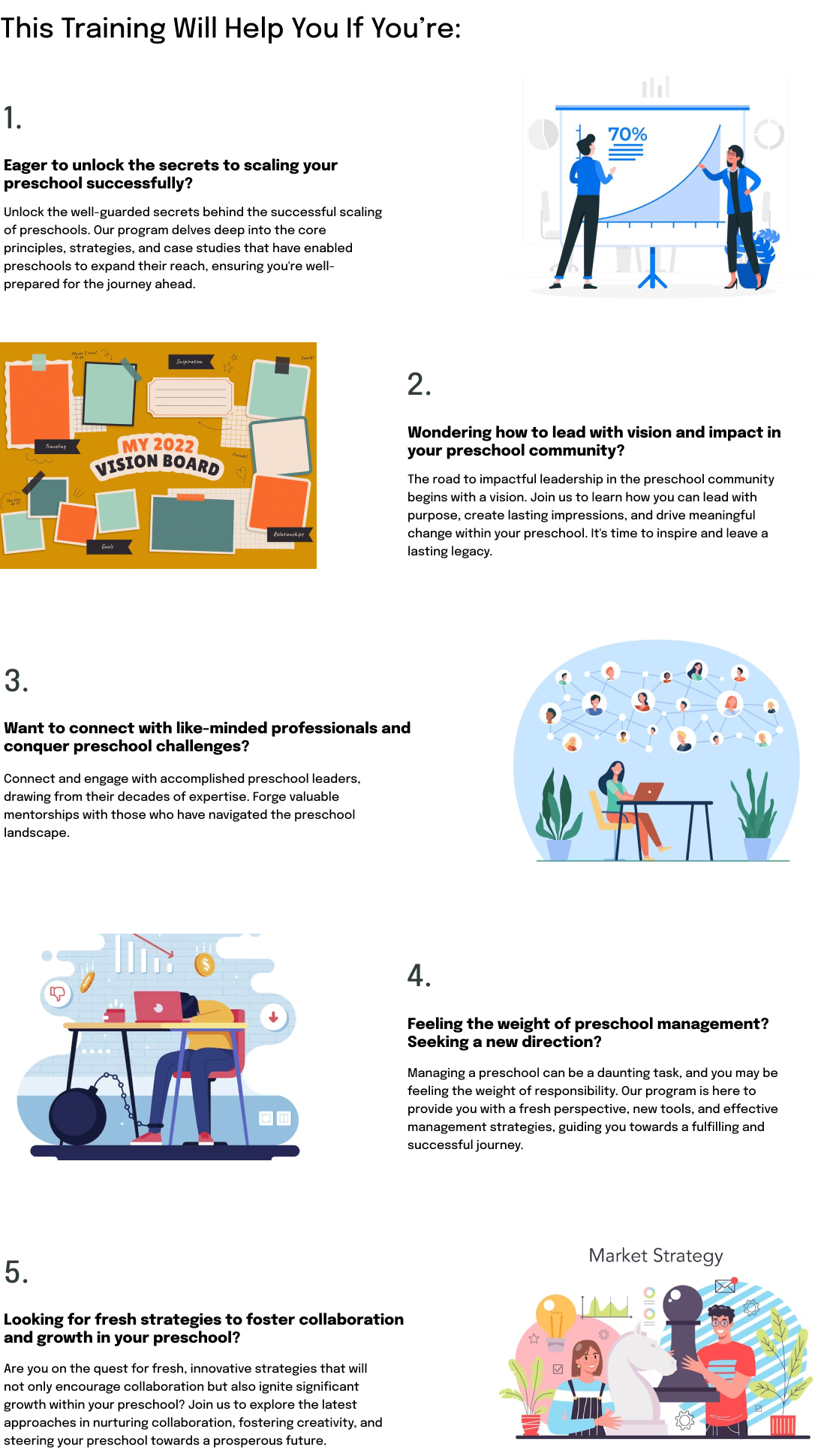 The Training is specifically designed for Preschool Leaders, Principals, Directors, and Preschool Owners who are keen on enhancing their leadership skills and fostering a supportive community.